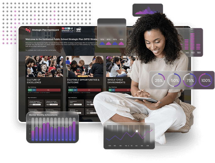 - Live strategic dashboards connect district goals, initiatives, and KPIs