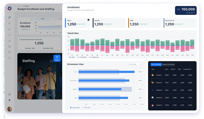 Superintendents, enrollment officers, HR teams, and finance leaders use the dashboard to monitor student numbers, manage capacity, and plan for future growth or declines.