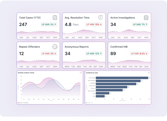 Identify trends, track investigation timelines, and monitor hotspot areas. Visual dashboards give leaders real-time insight into bullying patterns, recurring issues, and overall case volumes to inform smarter intervention strategies.