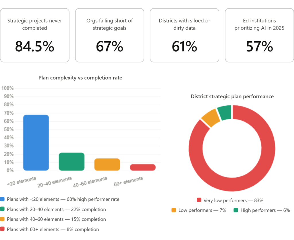 Research across more than 20,000 real strategic plans shows that 84.5% of strategic projects fail to reach completion, and only 5.7% of organizations consistently complete 75% or more of their plans. In K-12, the situation is compounded by the sheer complexity of what districts manage.