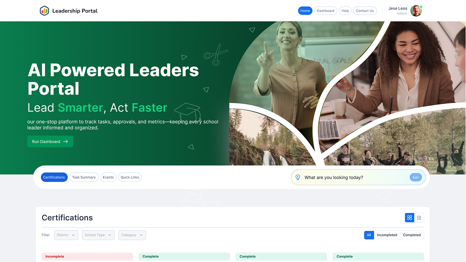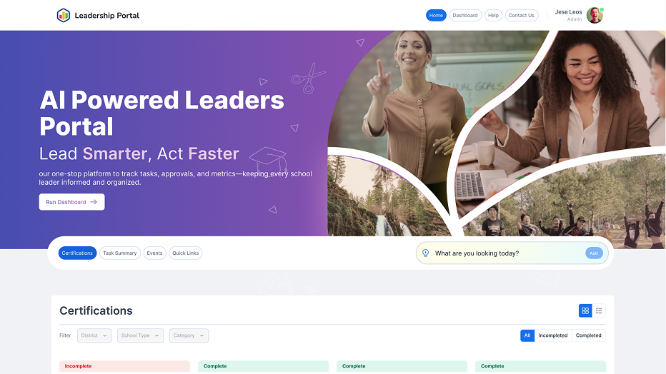 The Leadership Portal is an intelligent workspace powered by Hexalytics, designed specifically for school and district leaders. It centralizes planning, certifications, communication, and team insights into one connected platform — giving leaders a complete view of progress and priorities.