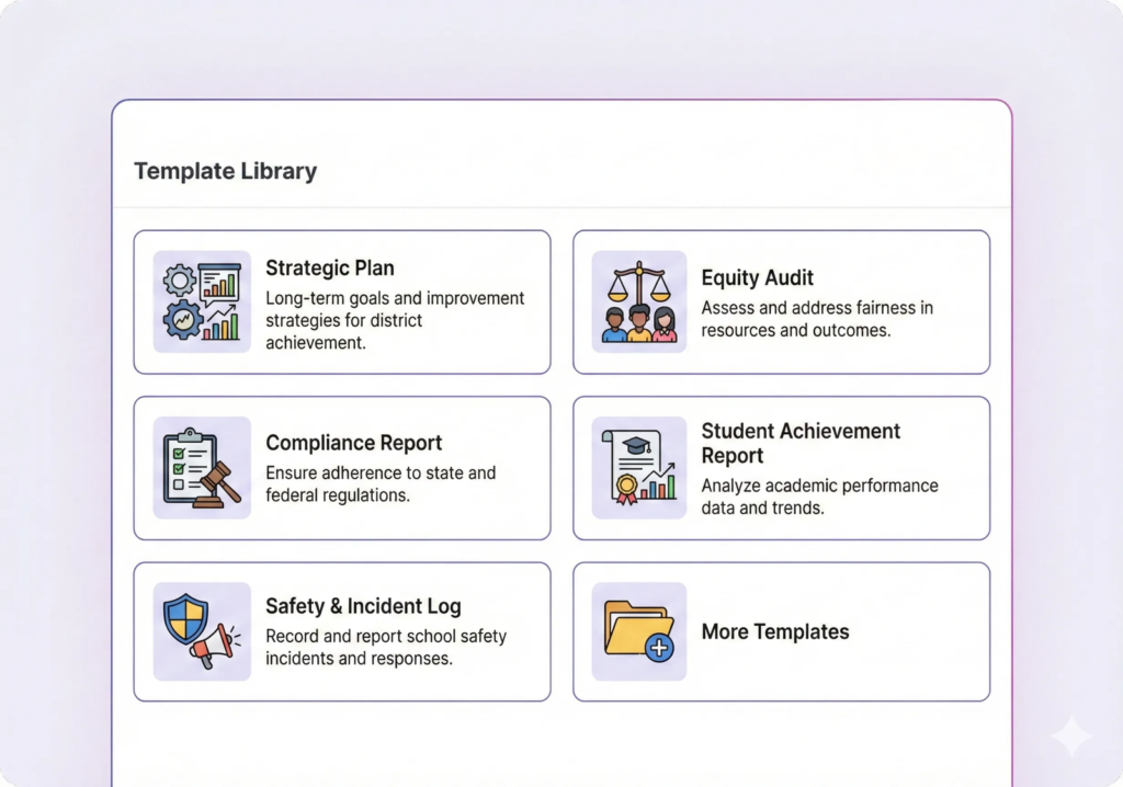 Jumpstart reporting with built-in templates for common district needs—strategic plans, equity audits, compliance reports, and more.