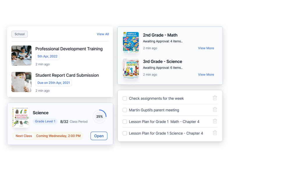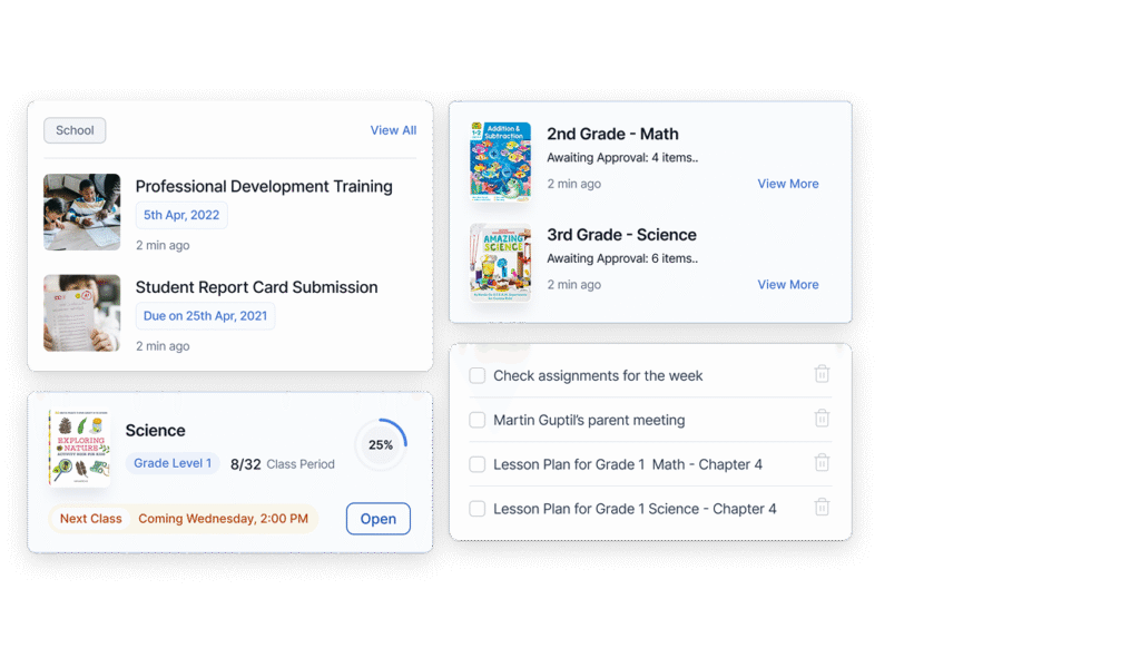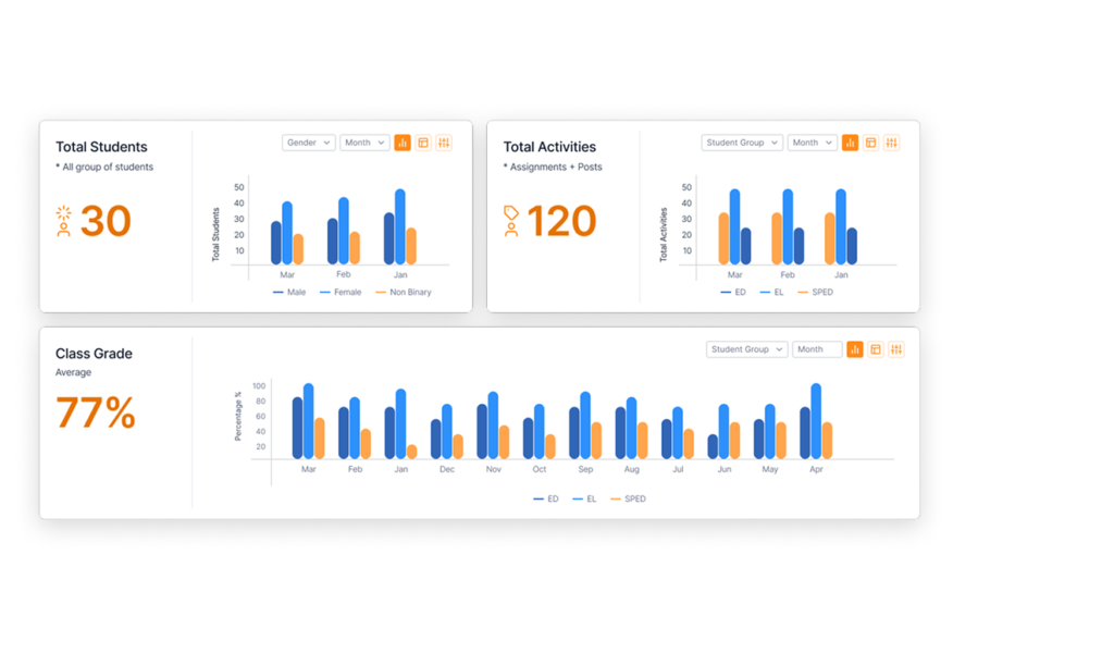 District and school leaders gain visibility through analytics dashboards—tracking assignment completion, attendance trends, intervention impact, and teacher workload. With data at your fingertips, you can act quickly to support both teachers and students.