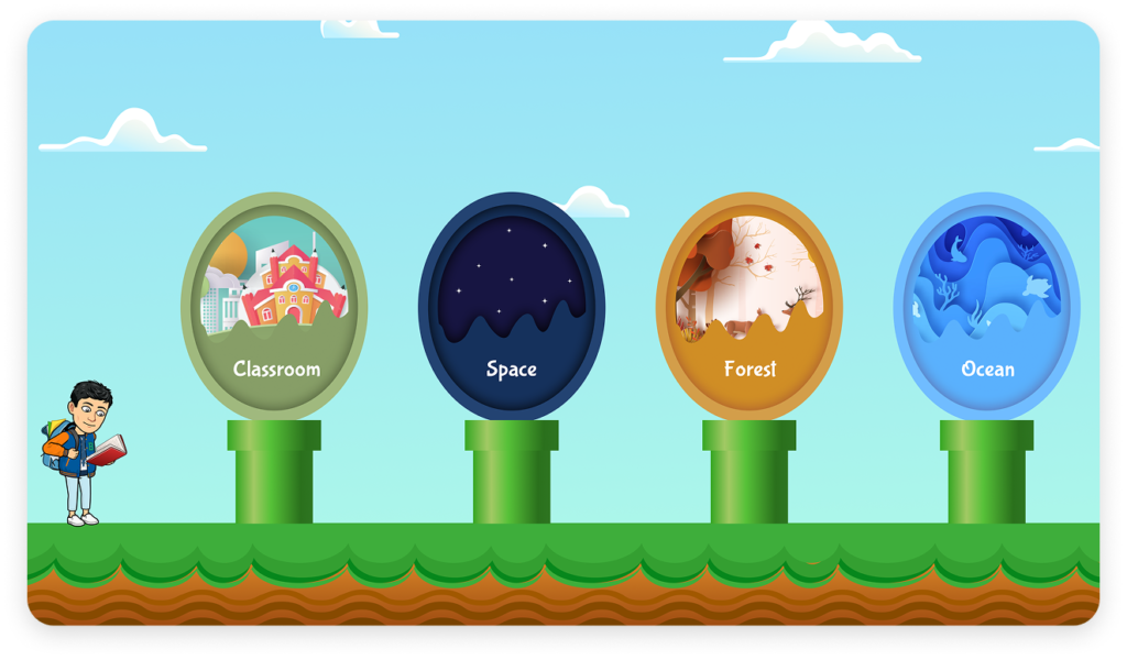 Students log into a modern, themed learning environment (e.g., “Ocean”, “Space”, “Jungle”) tailored to their age and preferences. They follow AI‑driven learning paths, track assignment progress, engage with gamified content, and receive instant feedback—enhancing motivation and engagement.