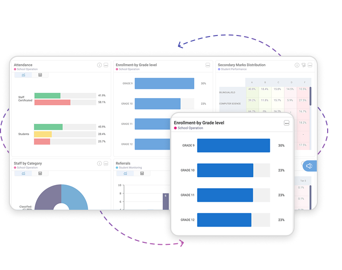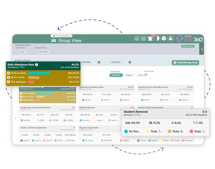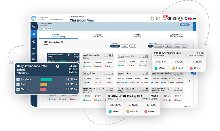 Unified dashboards that combine academic, social, and emotional indicators into one clear view of progress toward student and district goals.